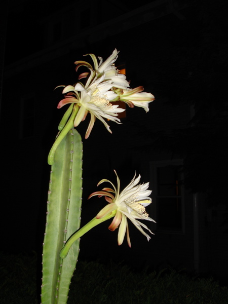 I took some of these pictures on Friday then waited for something to happen. There was a storm on Sunday and two of the blossoms broke off. Or maybe the plant couldn’t sustain all six of them. Tuesday night, always at night, the first blossom opened. Last night the others opened.
