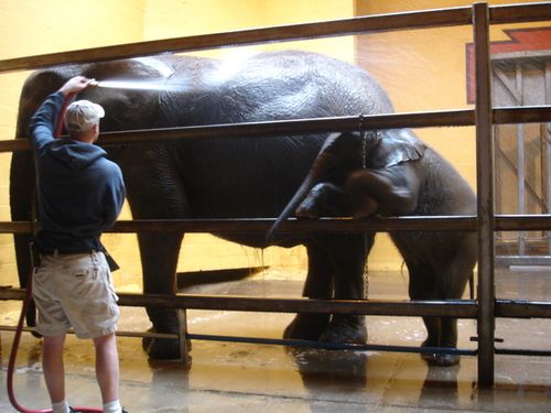 Mama is getting a shower while baby tries to steal the treats given to Mama as a reward. Baby did not want to participate in the shower.