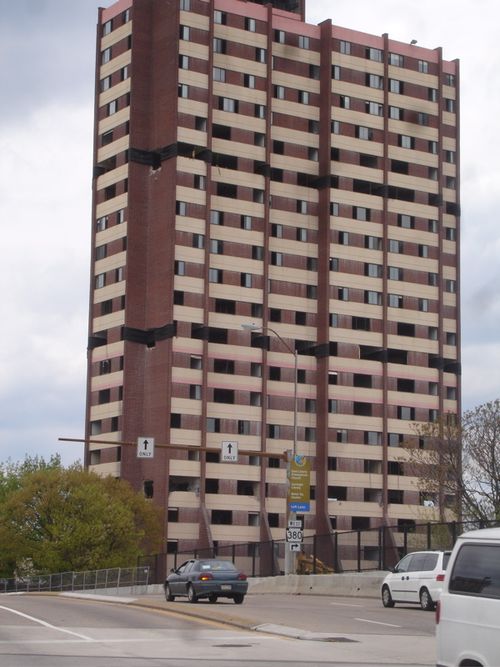 This is one of those awful public housing projects that were built in the early days of urban renewal. They are getting ready to implode it; you can see where some of the facade has been removed. I wish I knew when they were going to do it. I'd like to be there to watch. This is on my way to Whole Foods and other good places and will be replaced by a Target.
