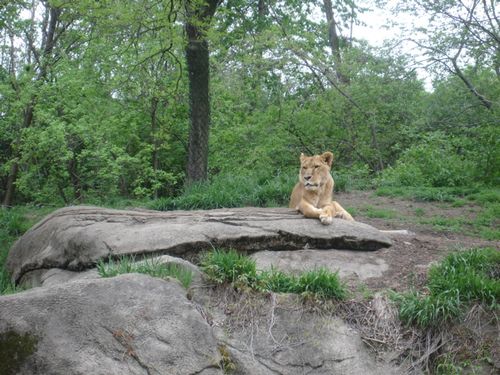 The queen of beasts, lounging around while the king loudly announces his presence. Another male, housed separately, answers him, like an echo.