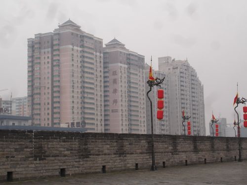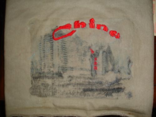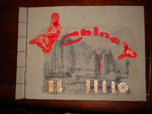 I did a photo transfer on the now empty front section of the bag. I consulted several books and the internet and my friend SandyB, who is wonderfully creative, gave me some excellent advice. I printed this photo backwards, with China 2008 added to it, on an inkjet transparency.