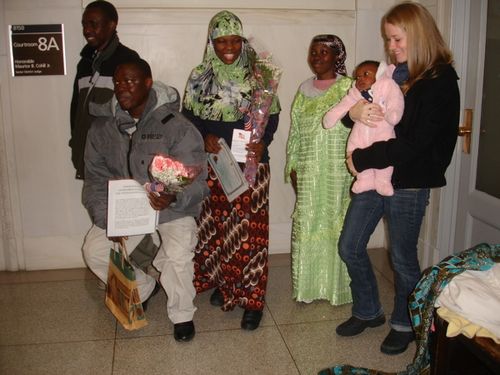 Abdul is holding the certificate of naturalization (and the shopping bag), the Somali woman next to him also became a citizen, next to her is Abdul's wife, holding Abdul's baby is a young woman who has been tutoring the other two children.