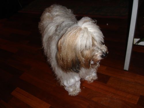 Darcy, after a not very successful walk. Note the snowballs on her feet. Her back legs were worse. She likes cold, but not snow.