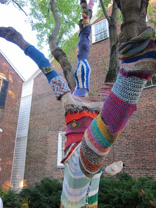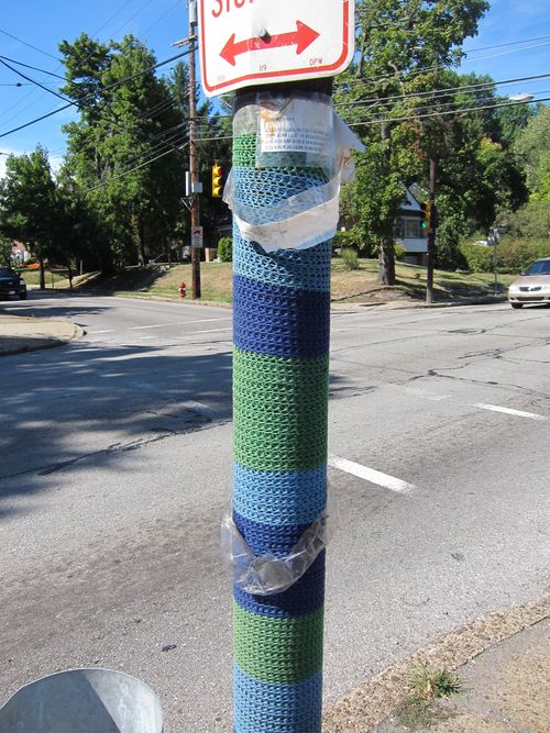 After two gray, rainy days the sun shining today lured me out of the house even though it was quite cold. I walked to the health club, did my usual workout, then walked home. I usually carry a camera with me wherever I go, but, this morning, decided to travel light. Within the first block I was sorry. There were interesting leaves on the ground and when I got to Penn Ave. there was this signpost with the crocheted coat (photo taken weeks ago).