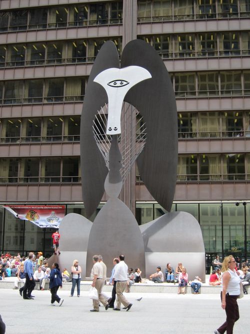 At breakfast with Eli this morning I said I would not want to move back here. Walking downtown afterwards I could feel the power and energy of the city and realized I still loved it. The sun was shining; lots of people on the streets; the city looked wonderful. Once I knew every building, every alcove and alley. Now there are many surprises. Walking toward the Daley Center I stopped to take a picture. Someone came over to me and said the Stanley Cup was there. I could stand in line to have my picture taken with it, or just take a picture of it. It’s there, somewhere, behind the Picasso sculpture.