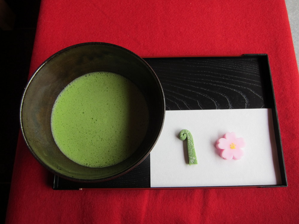 Frothy, powdered green tea with sweets. Note the pink sakura