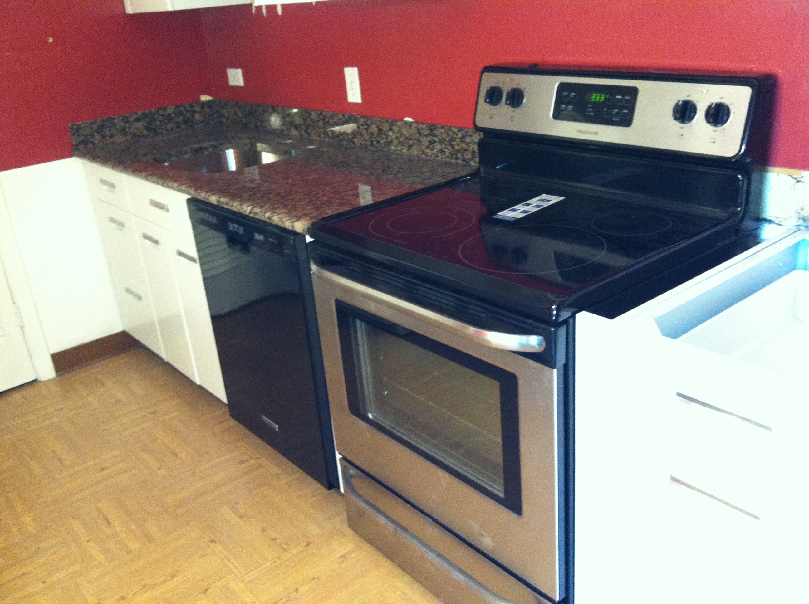 Installation was very quick, but much remains to be done. We aren’t supposed to touch it for 24 hours while the glue sets that’s holding the back splash in place. Ed will have to install the faucet, the garbage disposal and connect the water. He installed the stove and removed the florescent lights that were in the kitchen to be replaced with track lighting. After that, he will only have the floor left. We’re putting in the same laminate I installed in the living room and bedroom. Probably after I move in Perry will return to paint the kitchen. He has a job he thinks will last for two weeks. All I have left now is packing and only seven days. Ha!