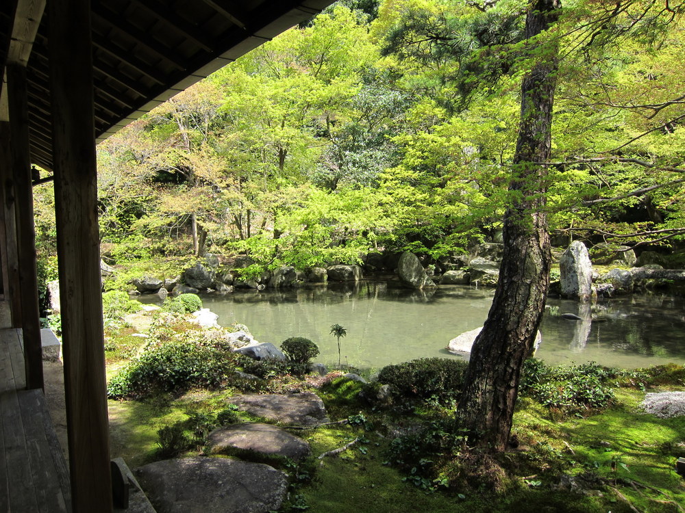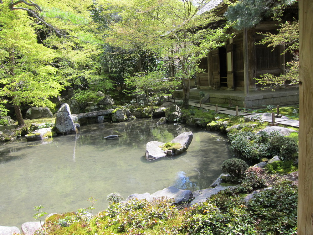 On a day of warmth and sunshine I started out for three temples, all located at the foot of the mountains on the northern border of Kyoto. As none of these temples are well known or well publicized they were peaceful and wonderful with only a few other people visiting with me. At the first, Genko-an, I was welcomed with  lovely incense indoors and the fragrance of the blossoms outdoors. The temple is noted for its two windows, one square, the Window of Delusion, implying confusion, ignorance and immaturity; a life of human suffering; and one round, implying Zen maturity, completeness and enlightenment.